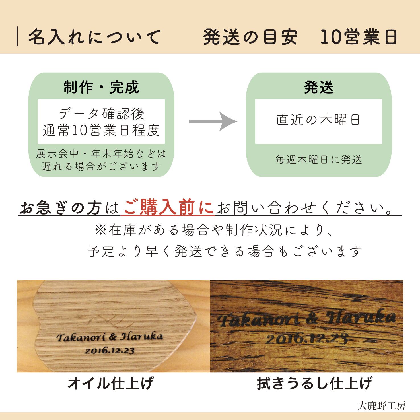 額やリングスタンド等の木製品は、通常10営業日以内に制作完了、その後直近の木曜日に発送いたします。