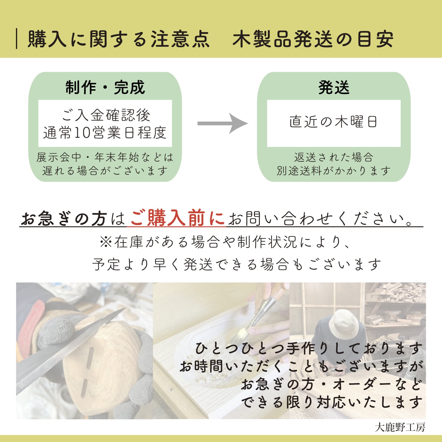 額やリングスタンド等の木製品は、通常10営業日以内に制作完了、その後直近の木曜日に発送いたします。